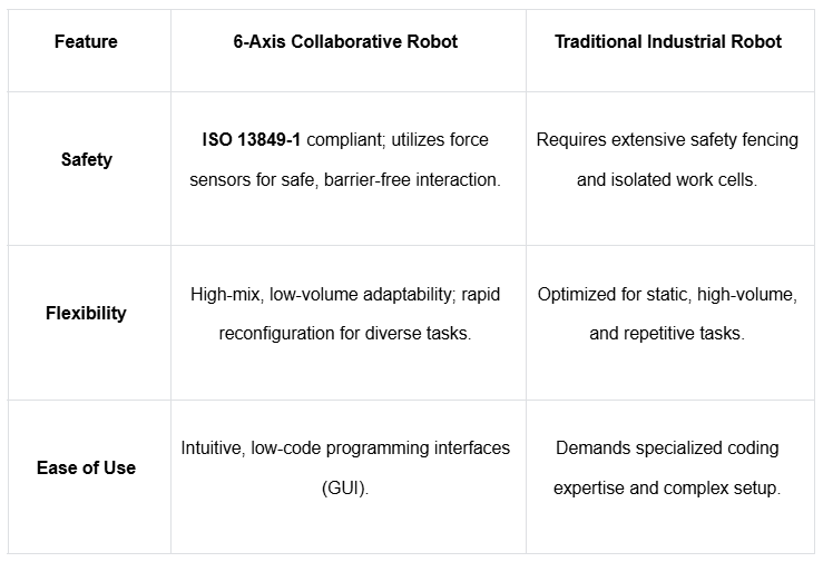 A diferencia de la automatización tradicional diseñada para el aislamiento, el Robot colaborativo de 6 ejes está diseñado para la interacción. Aunque iguala la capacidad mecánica (o la precisión) de los sistemas heredados, su valor diferencial reside en su filosofía de diseño "sin barreras", que le permite operar con seguridad junto a los humanos sin barreras físicas.